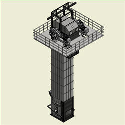 由于水泥企業規模的不斷擴大和節能減排的要求,在國內外采用輥壓機用于生料終粉磨和水泥聯合粉磨也越來越多,其單臺的能力也不斷擴大,使得與之相配套的輸送設備-單臺提升機的能力也在提高。由于此處的物料是塊狀的且磨琢性很大,因此只有板鏈提升機能夠適用。但由于輥壓機出輥物料不穩定及磨琢性大等特性及生產工藝問題,經常造成提升機堵料、漏料、設備振動、電機頻繁跳停、物料回料量大等現象,嚴重的影響了整個系統的運轉率。我公司集多年板鏈提升機設計和制造經驗,開發出了適用于此工藝系統的大輸送量的大型板鏈斗式提升機,使得整個工藝系統不因板鏈斗式提升機的故障而影響整個系統的運轉率。